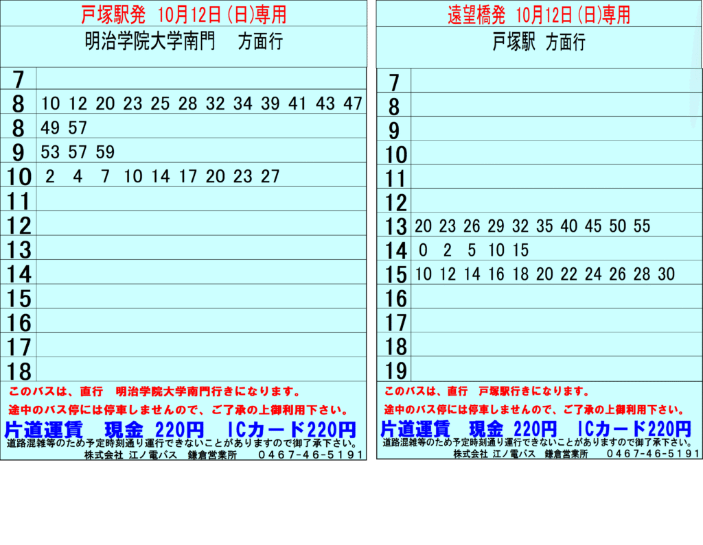 2025年10月12日(日)、明治学院大学線におきまして臨時バスを運行いたします。