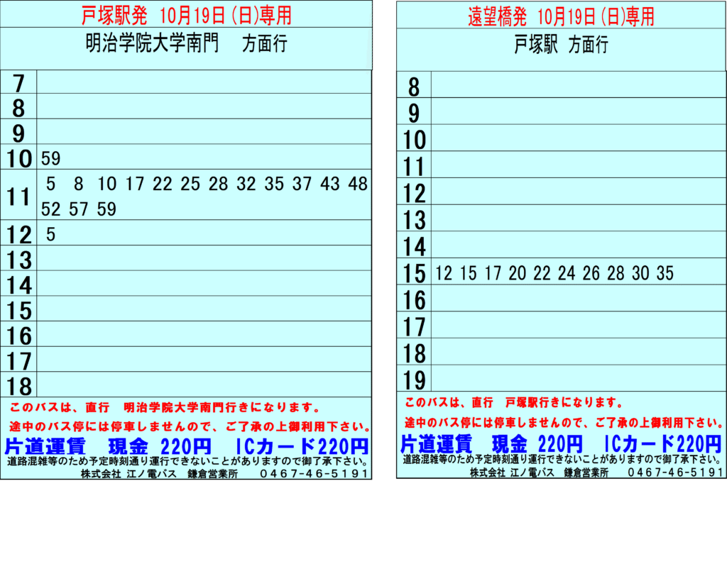 いつも江ノ電バスをご利用いただきまして、誠にありがとうございます。2025年10月19日(日)、明治学院大学線におきまして臨時バスを運行いたします。ご利用のほどよろしくお願いいたします。
