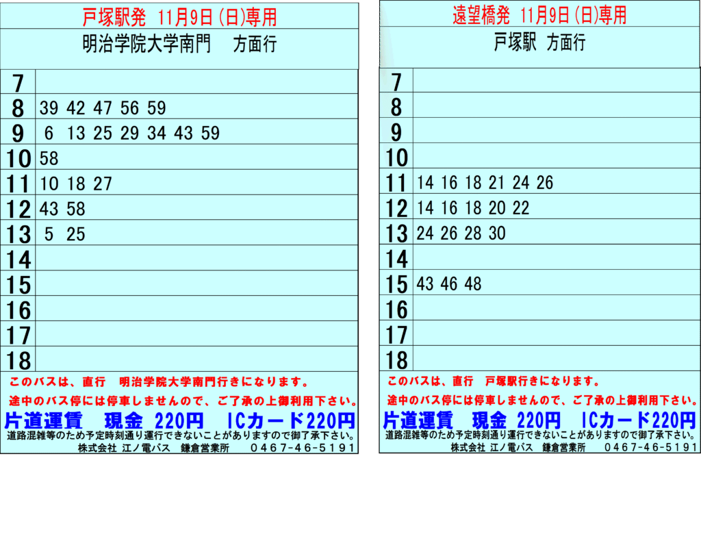 いつも江ノ電バスをご利用いただきまして、誠にありがとうございます。2025年11月9日(日)、明治学院大学線におきまして臨時バスを運行いたします。ご利用のほどよろしくお願いいたします。