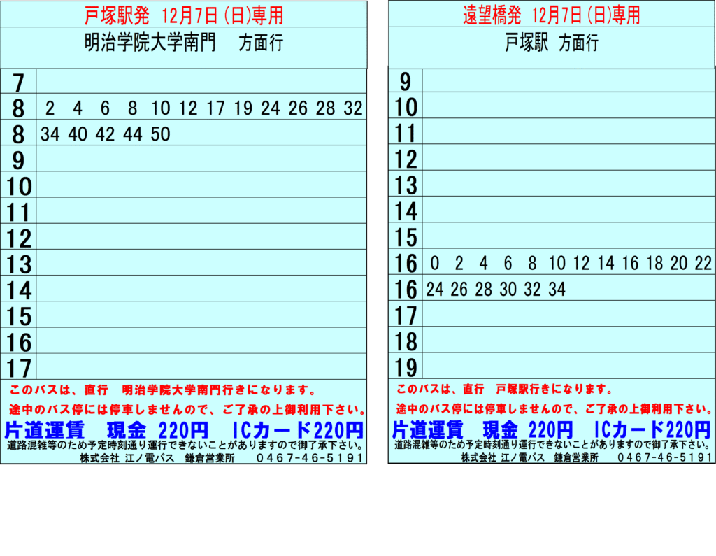 いつも江ノ電バスをご利用いただきまして、誠にありがとうございます。2025年12月7日(日)、明治学院大学線におきまして臨時バスを運行いたします。ご利用のほどよろしくお願いいたします。