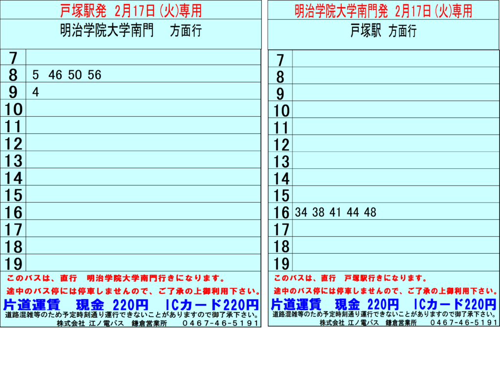 総合トップバス【2/17】明治学院大学線 臨時バスの運行について