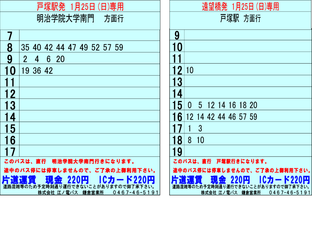 いつも江ノ電バスをご利用いただきまして、誠にありがとうございます。2026年1月25日(日)、明治学院大学線におきまして臨時バスを運行いたします。ご利用のほどよろしくお願いいたします。