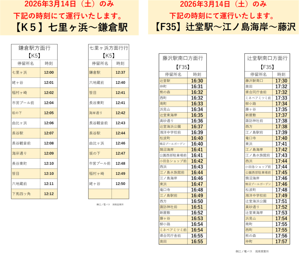 2026年3月14日(土)に湘南営業所管轄路線におきまして、1日限定の臨時バスを運行いたします。