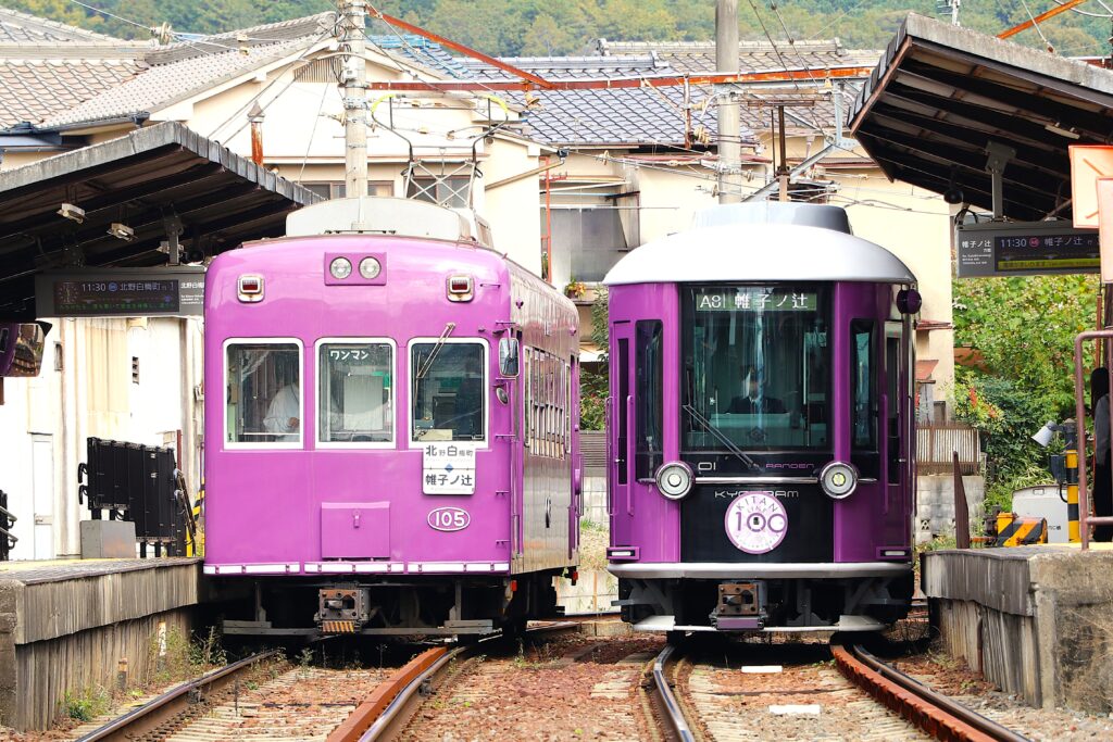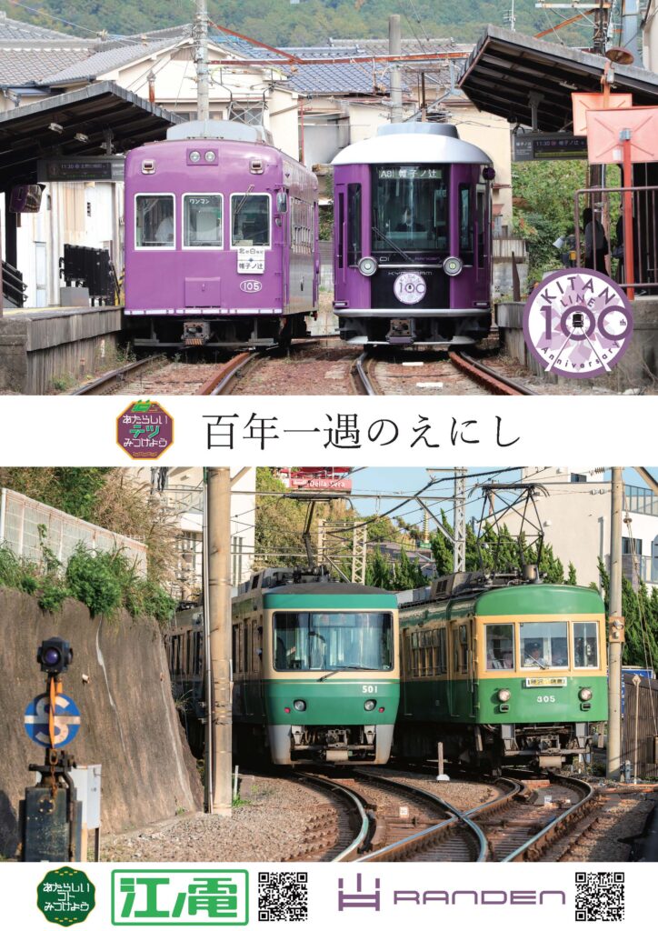 嵐電では、本ポスターに合わせ北野線の鳴滝駅で古参のモボ101形105号と、2025年に営業運転を開始したモボ1形KYOTRAMが離合する瞬間を撮影し制作しました。江ノ電と共に、古き良き車両と新たな車両が共存する姿を映し出すことで、両社に共通する「歴史を受け継ぎながら未来へつなぐ」という姿勢を表現しています。