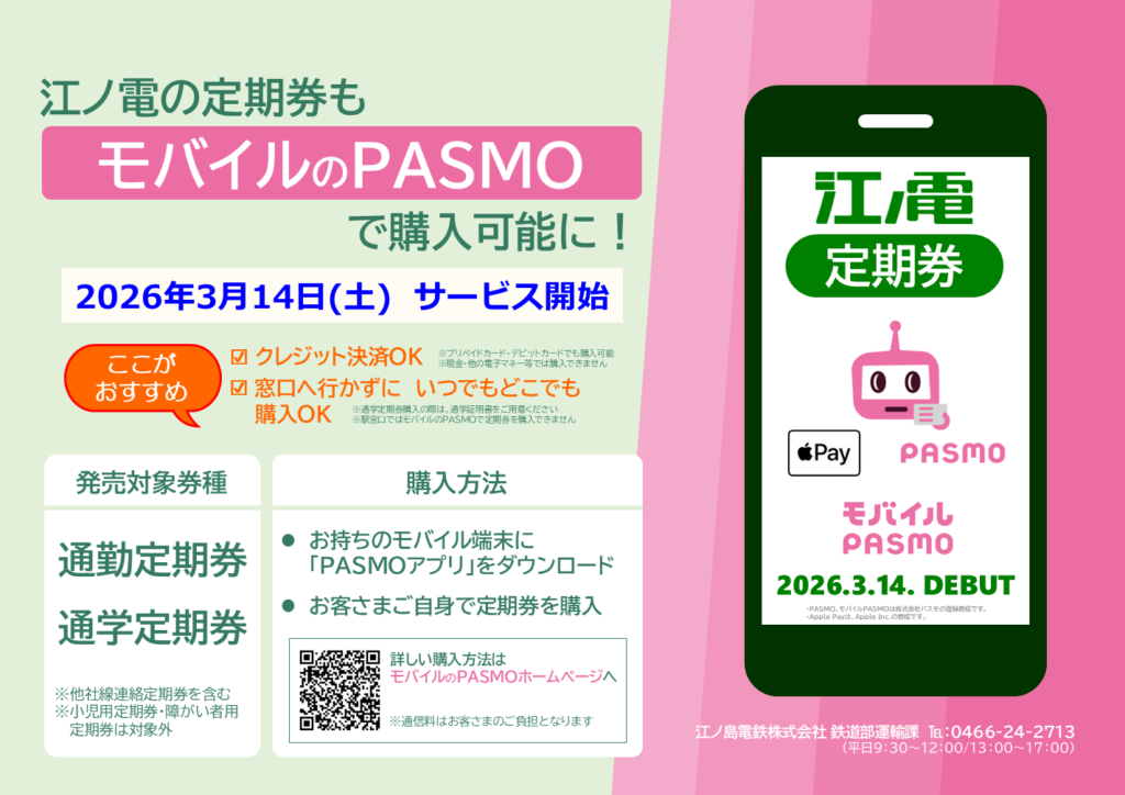 江ノ島電鉄では 2026年3月14日(土)より、モバイルのPASMOで定期券をご購入いただけるようになります。PASMOアプリをインストールしたモバイル端末上で定期券を購入し、その端末を駅の改札にタッチしてご利用いただけるサービスです。■購入方法の詳細は、モバイルのPASMOホームページをご覧ください。https://www.pasmo.co.jp/mp/