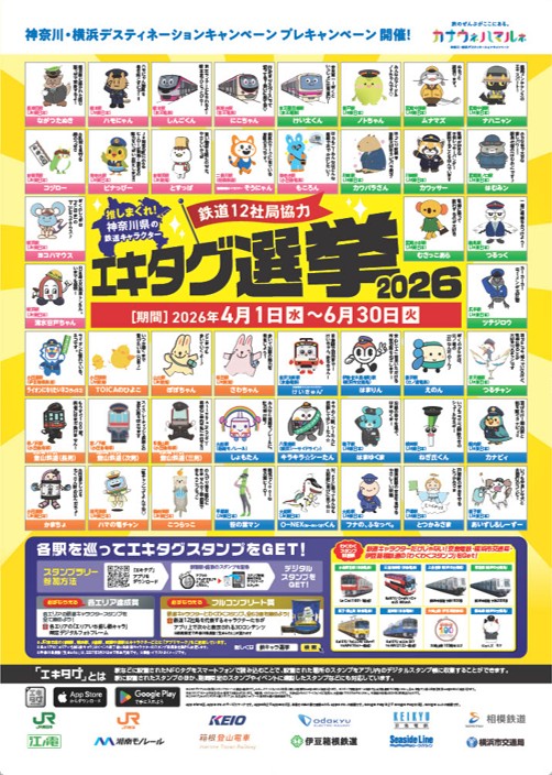 「推しまくれ!神奈川県の鉄道キャラクターエキタグ選挙2026」は、2026年4月1日(水)~6月30日(火)に開催される「神奈川・横浜デスティネーションキャンペーン プレキャンペーン」にあわせて開催。